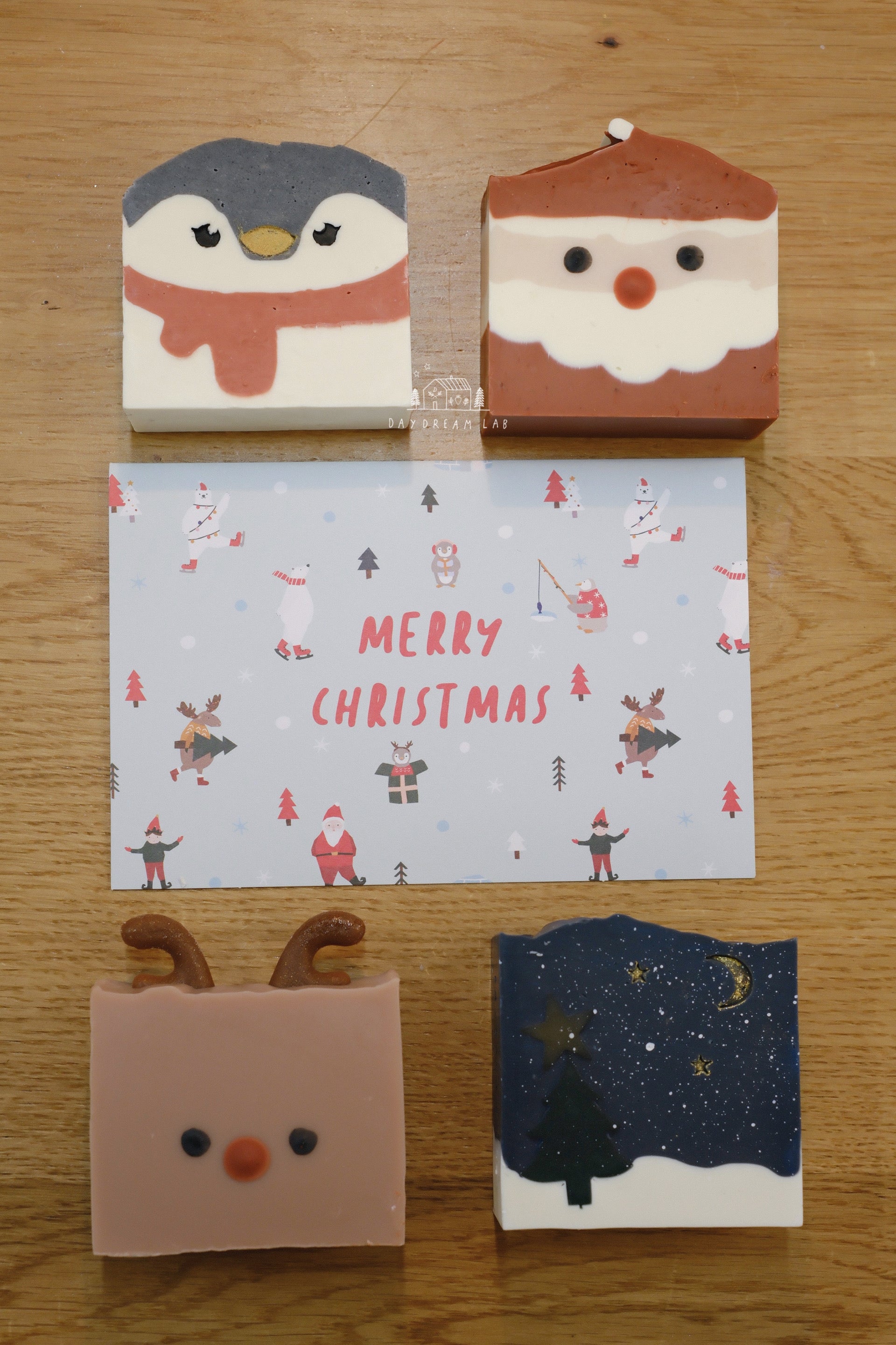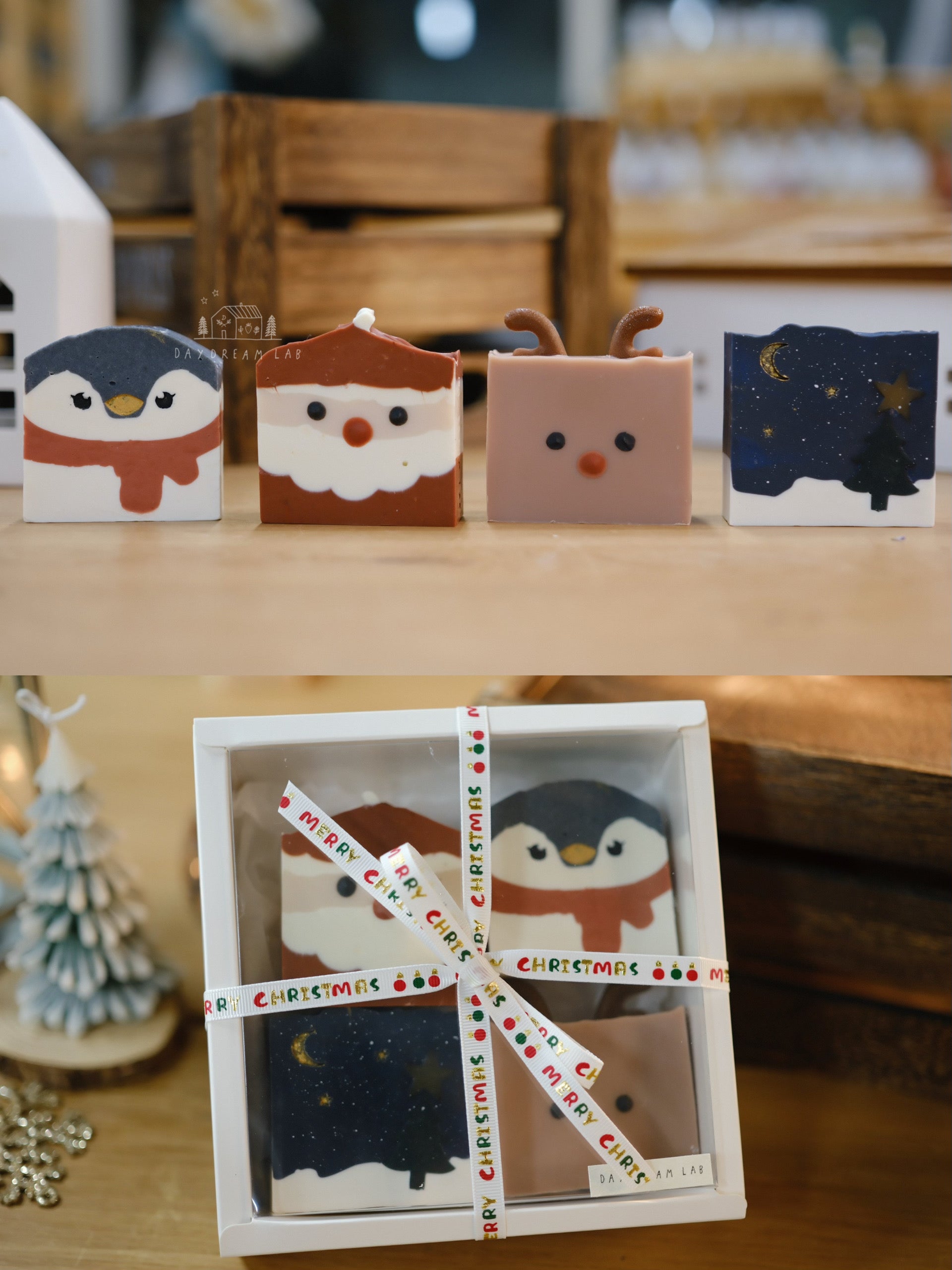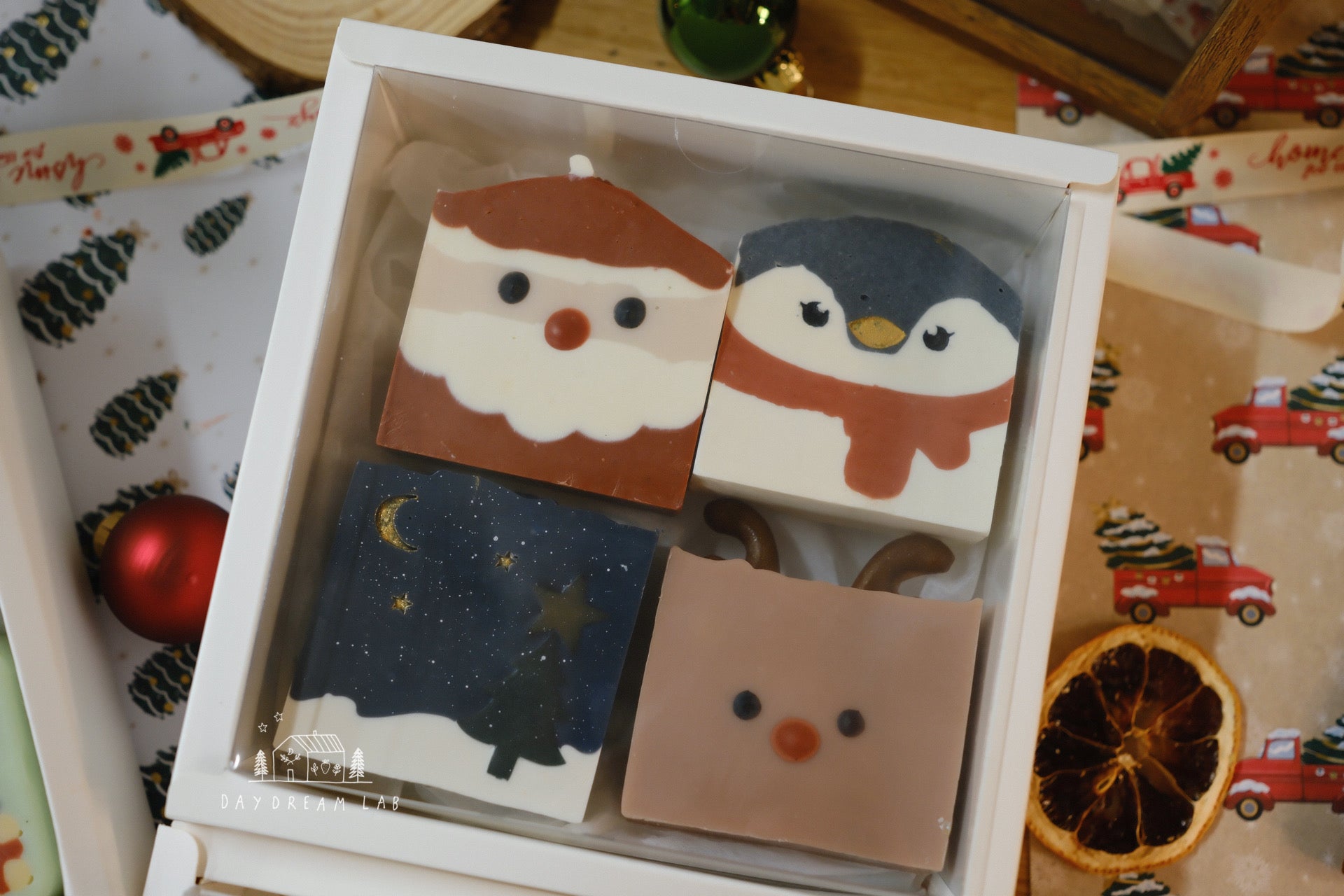 This Christmas handmade cold process soap gift box features Santa Claus, a reindeer, a Christmas tree adorned with stars, and adorable little penguins, each showcasing the festive joy of the season. Carefully crafted, each bar brings holiday cheer to your Christmas skincare routine