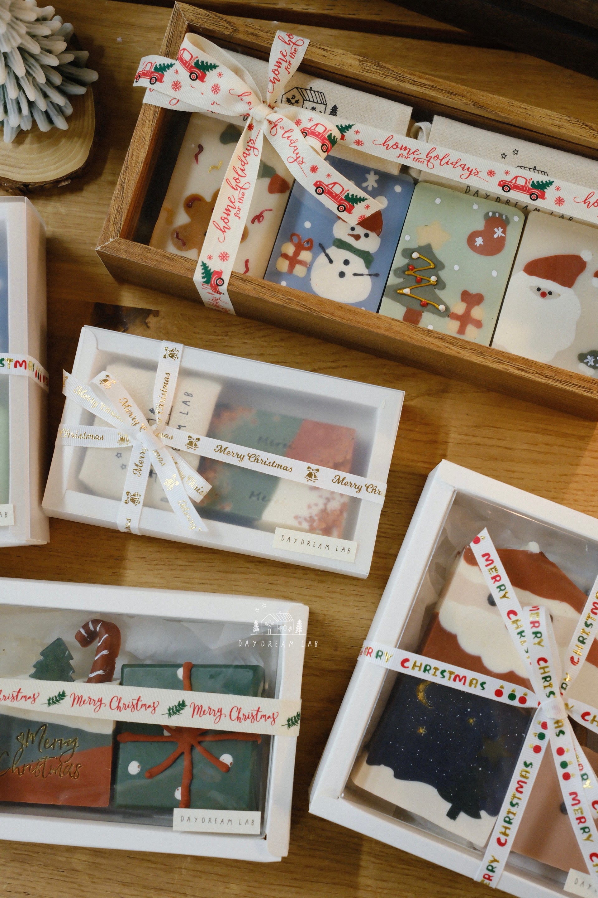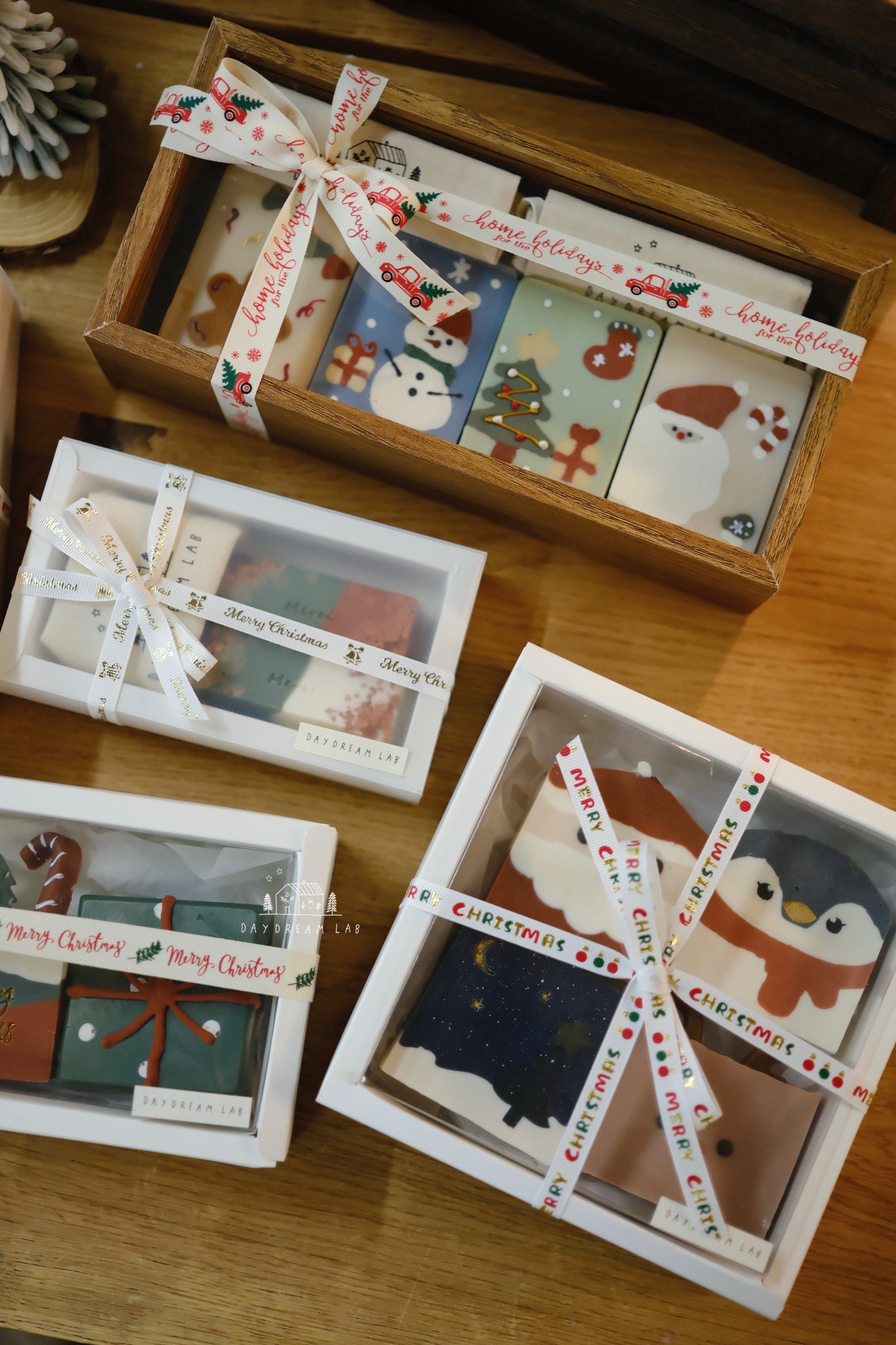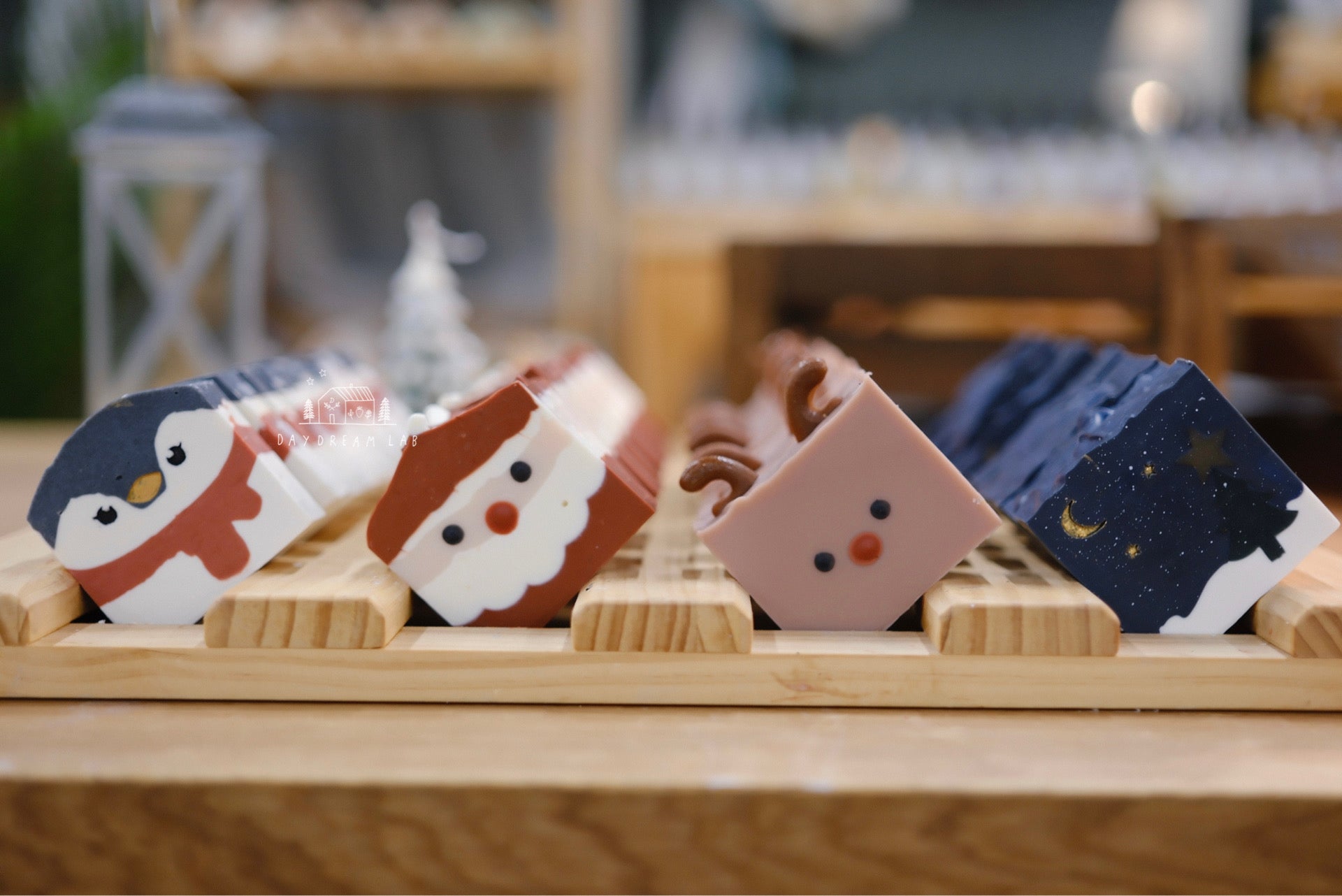This Christmas handmade cold process soap gift box features Santa Claus, a reindeer, a Christmas tree adorned with stars, and adorable little penguins, each showcasing the festive joy of the season. Carefully crafted, each bar brings holiday cheer to your Christmas skincare routine