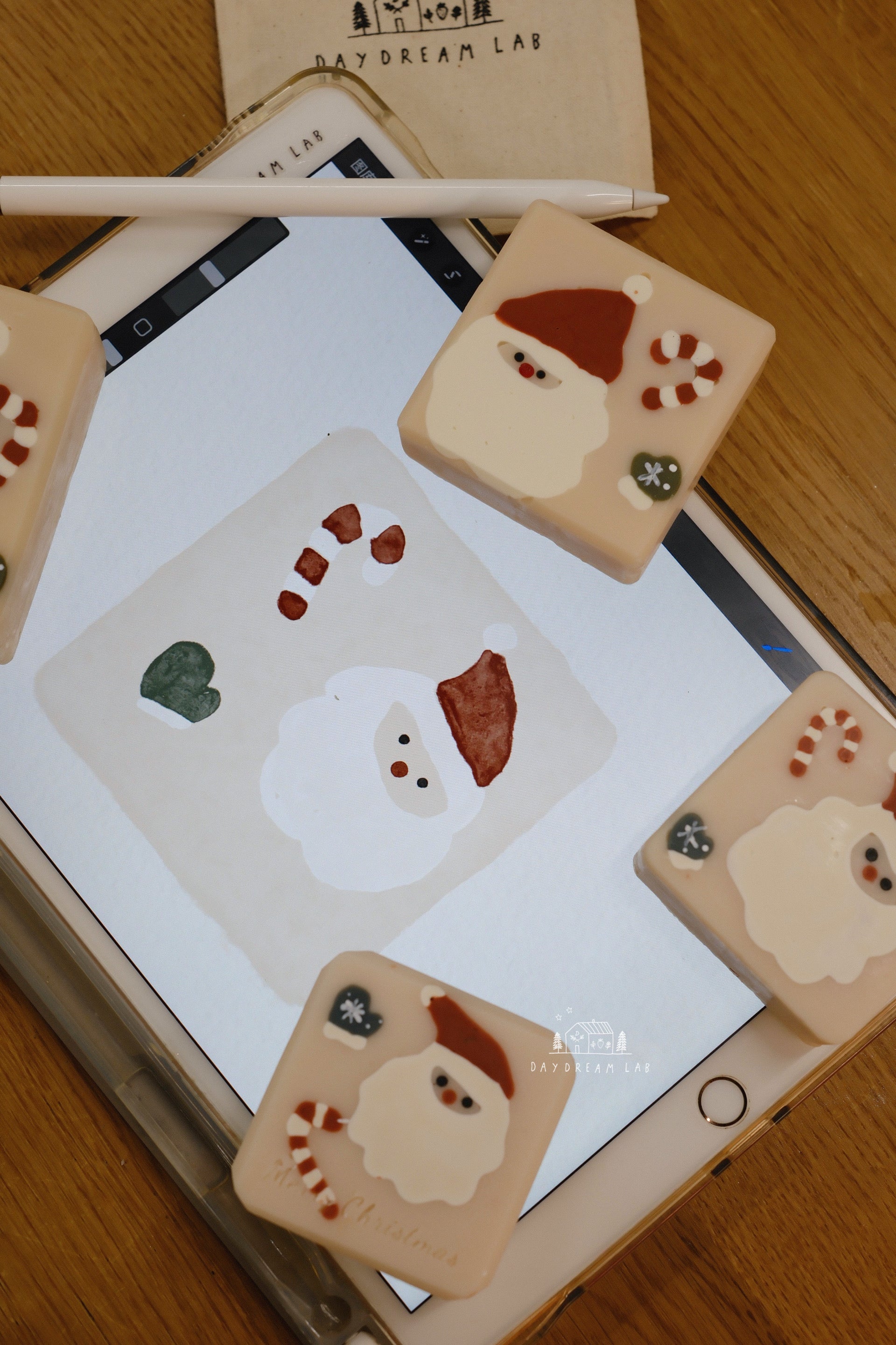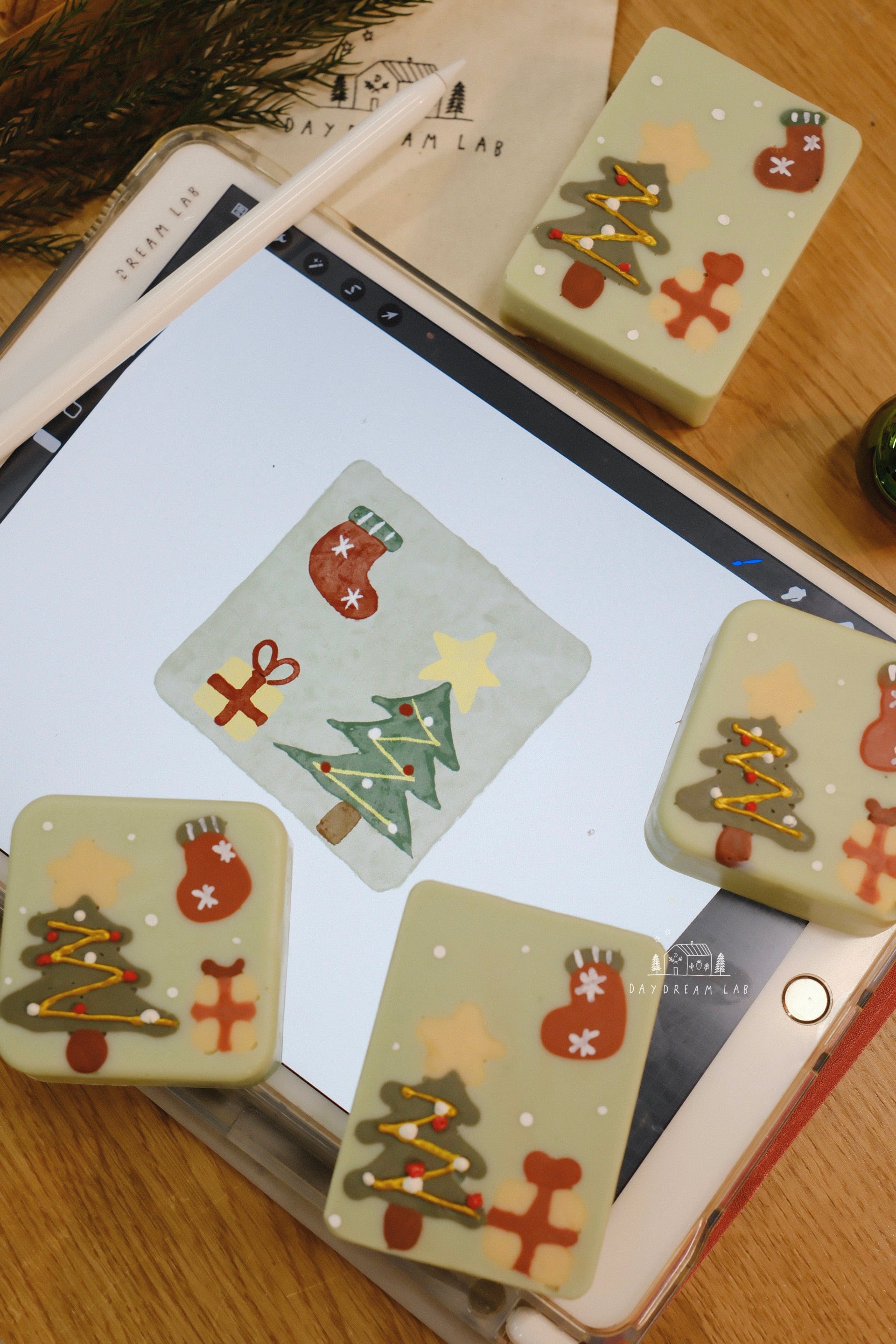 这款圣诞冷制手工皂礼盒由四块精心设计的手工皂组成。每一块都花费大量时间进行手绘,每一幅图案都是独一无二的。图案包含了圣诞老人、雪人、圣诞树、姜饼人、圣诞拐杖、小彩旗和圣代袜子等经典元素,散发着节日的欢乐氛围,让您充分感受浓浓的圣诞气息。