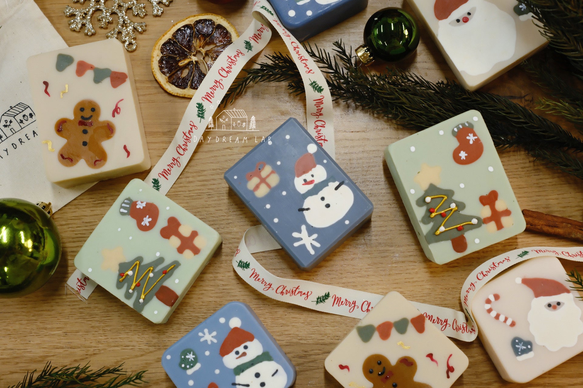 This Christmas Cold Process Soap Gift Box consists of four meticulously designed handmade soaps. Each one is individually hand-drawn, taking considerable time and effort. The patterns feature classic elements like Santa Claus, snowmen, Christmas trees, gingerbread people, candy canes, festive flags, and stockings, exuding the joyous holiday spirit and capturing the essence of Christmas.