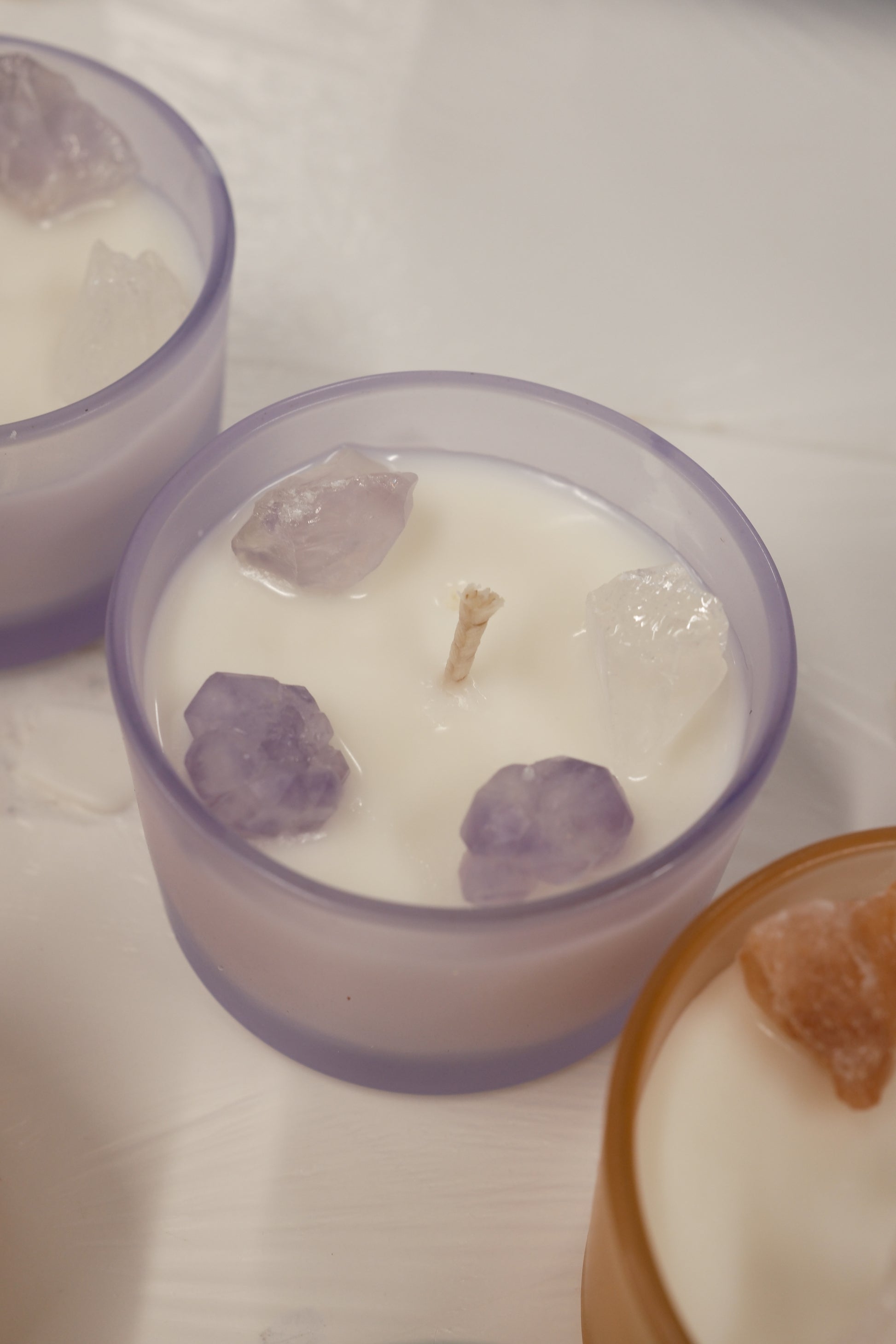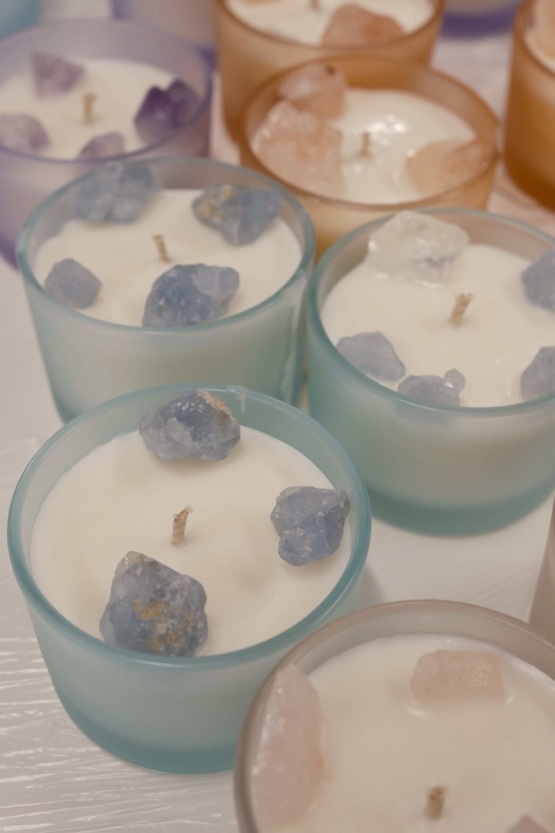 Illuminate your space with the radiant energy of our Crystal Glow Soy Wax Candle Collection.
