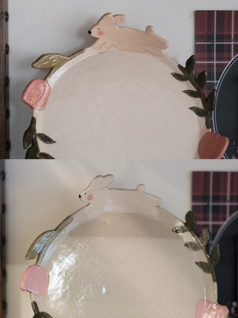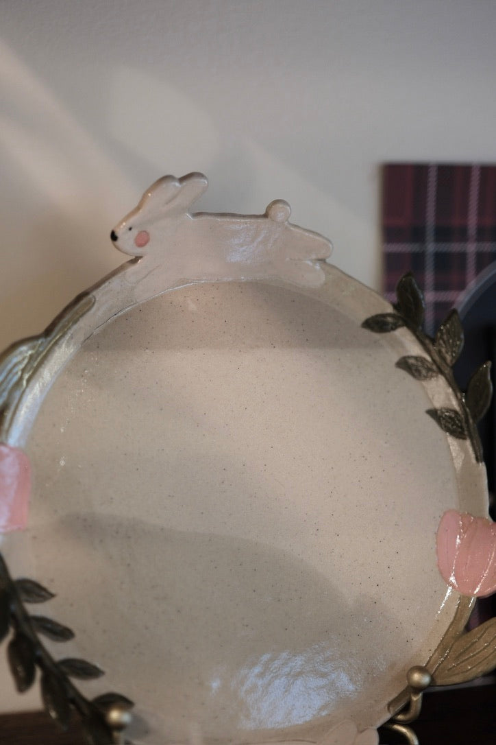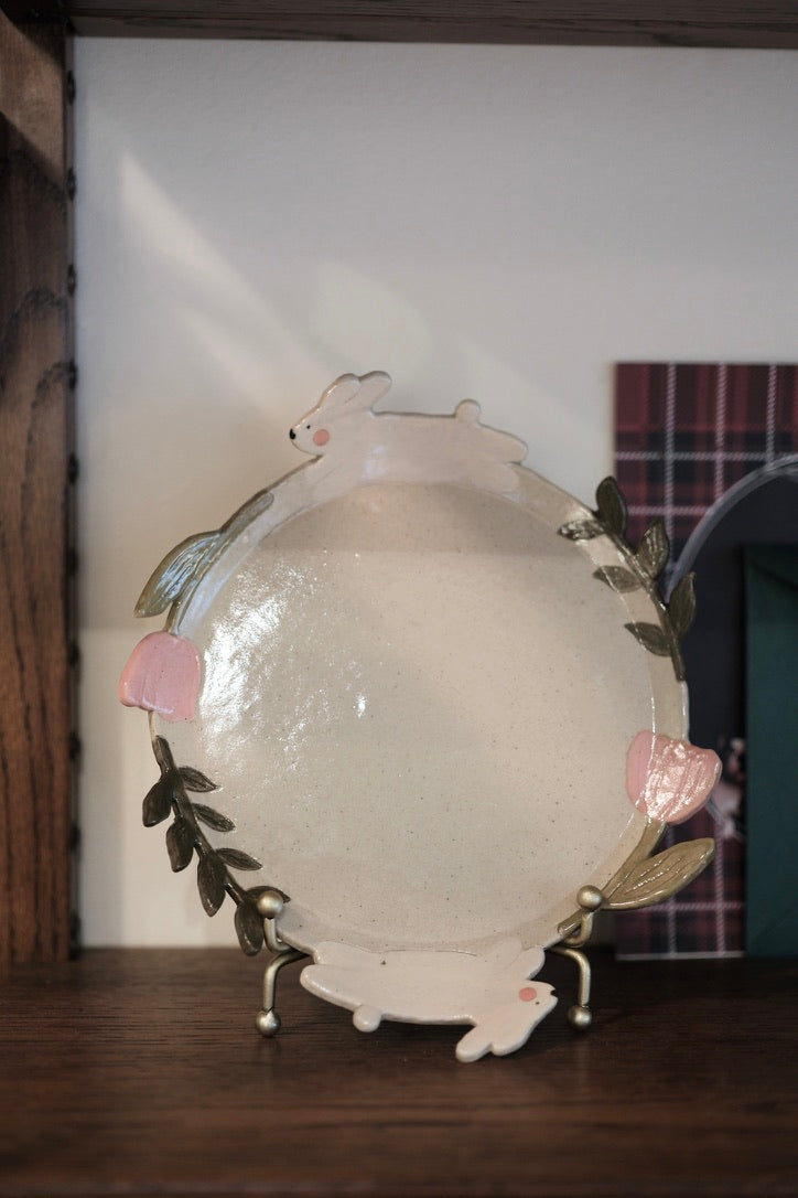 Little Nooks Ceramics | Handcrafted Ceramic Round Plate with Bunny, Flowers & Plants