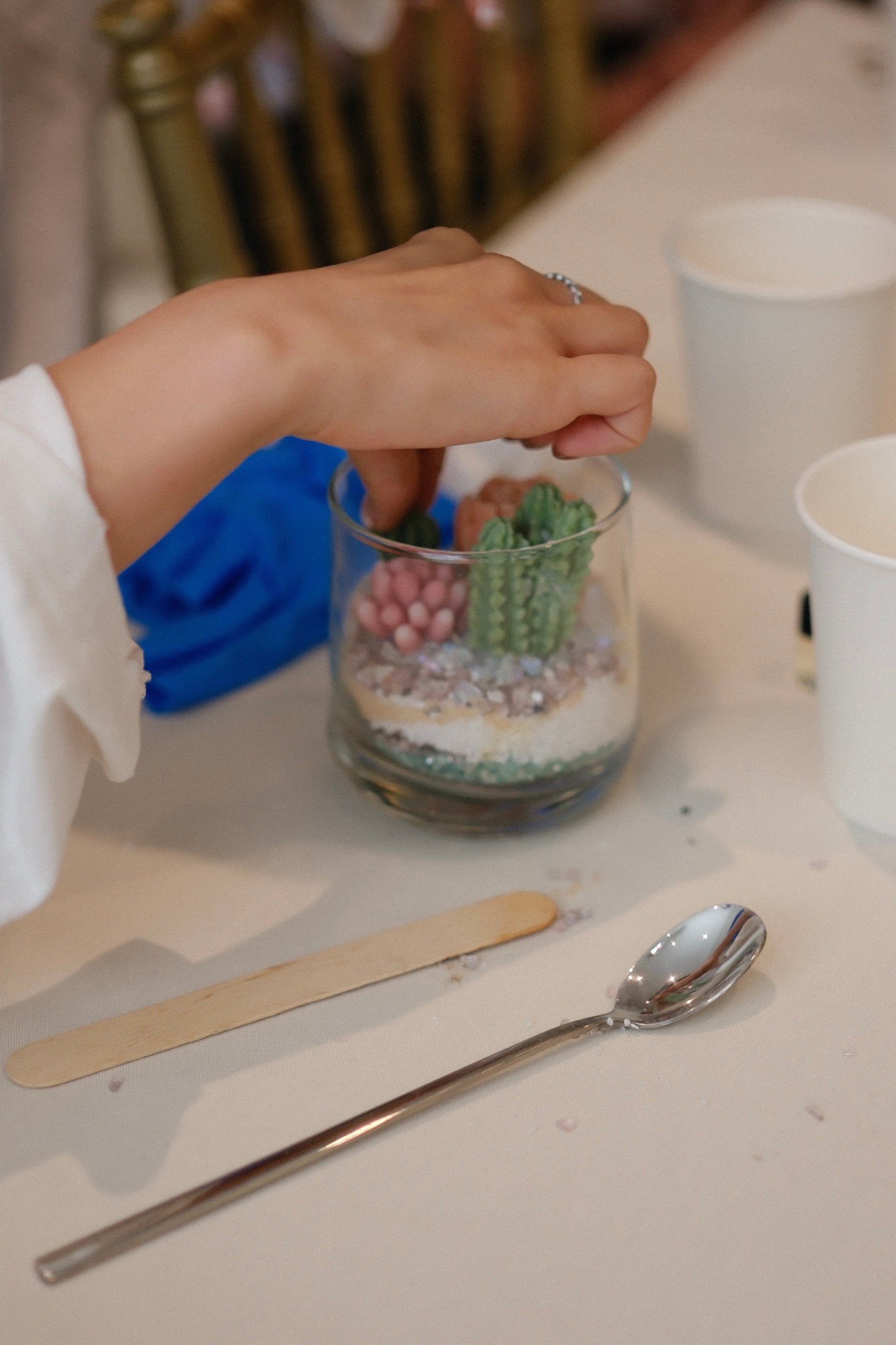在这个趣味满满的工作坊中,你可以亲手制作一款栩栩如生的盆栽蜡烛,既无需浇水,又是一款美观实用的扩香摆件!我们将使用透明玻璃杯作为容器,杯中的“沙土”部分由棕榈蜡精心制作而成。你可以自由选择颜色,将蜡层像沙画一样一层层堆叠,打造出独特而精致的底部效果。植物部分则由你亲自设计和调色,选择你喜爱的植物造型,制作出专属的蜡烛植物。完成后,将它们摆放在蜡制沙土上,Tada!一款独一无二的盆栽蜡烛就此诞生!完成后,你还可以在沙土上滴入精油,使它成为一个可爱的扩香器,让你随时享受香气的环绕。