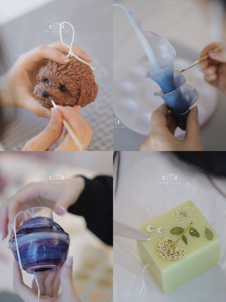 *实操课程涵盖网络上多种流行款式及技巧学习,使用蜡材涵盖大豆蜡、蜂蜡、棕榈蜡、石蜡、果冻蜡、微晶蜡及不同添加剂的使用